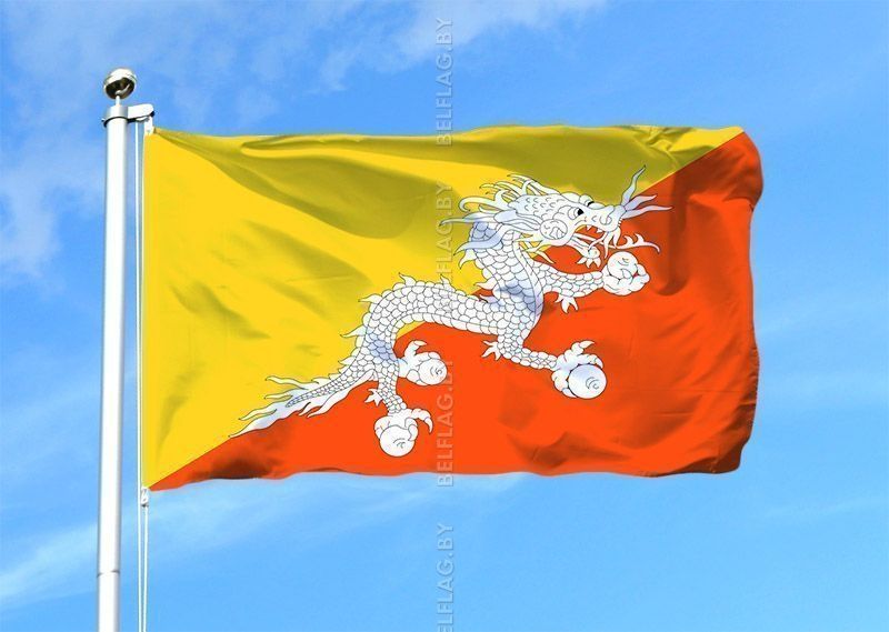 Национальный Флаг Бутана  представляет собой прямоугольное полотнище, разделённое по диагонали от нижнего угла со стороны древка к верхнему углу вольной части; левое треугольное поле — жёлтого цвета, правое — оранжевое. В центре расположен обращённый от древка белый дракон «друк», который держит в лапах драгоценные камни. Отношение ширины флага к его длине составляет 2:3.