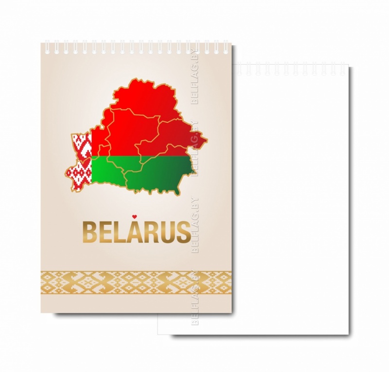 Сувенирный блокнот A5 с картой и стилизованным флагом Беларуси и орнаментом в цветах государственной символики. Плотная обложка 300 г/м² (4+0), 50 листов офсет 80 г/м², металлическая пружина сверху. Цена указана с НДС.