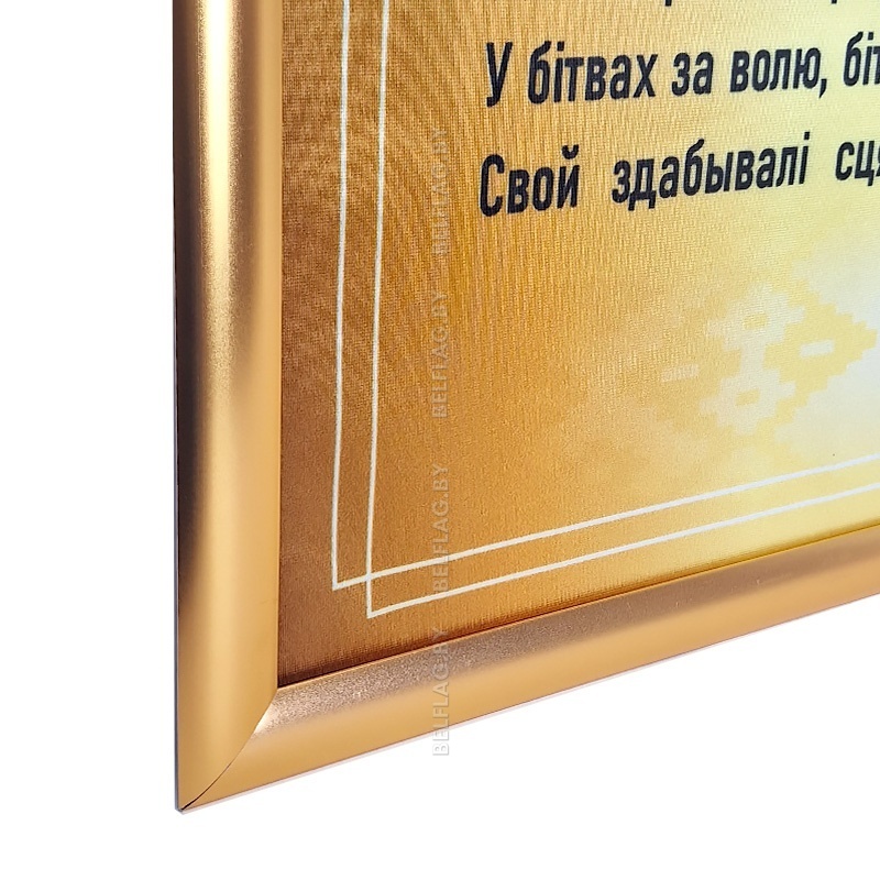 Большой постер A1 (594×841 мм) с флагом, гербом и полным текстом гимна Беларуси, напечатанный на ткани Атлас и оформленный в золотой рамке из анодированного алюминия: защёлкивающийся (snap) профиль 25 мм, защитная ПВХ-панель, настенное крепление и крепёж в комплекте.