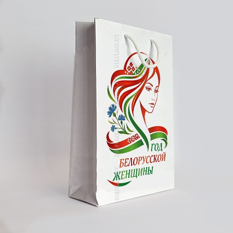 Подарочный бумажный пакет 220×320×80 мм с официальным логотипом «Год белорусской женщины» и картой — аккуратная упаковка для полотнищ флага РБ, флажков и сувенирных наборов.