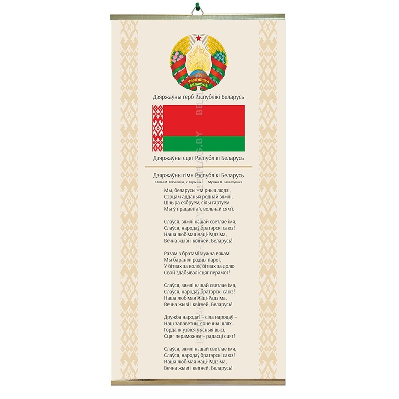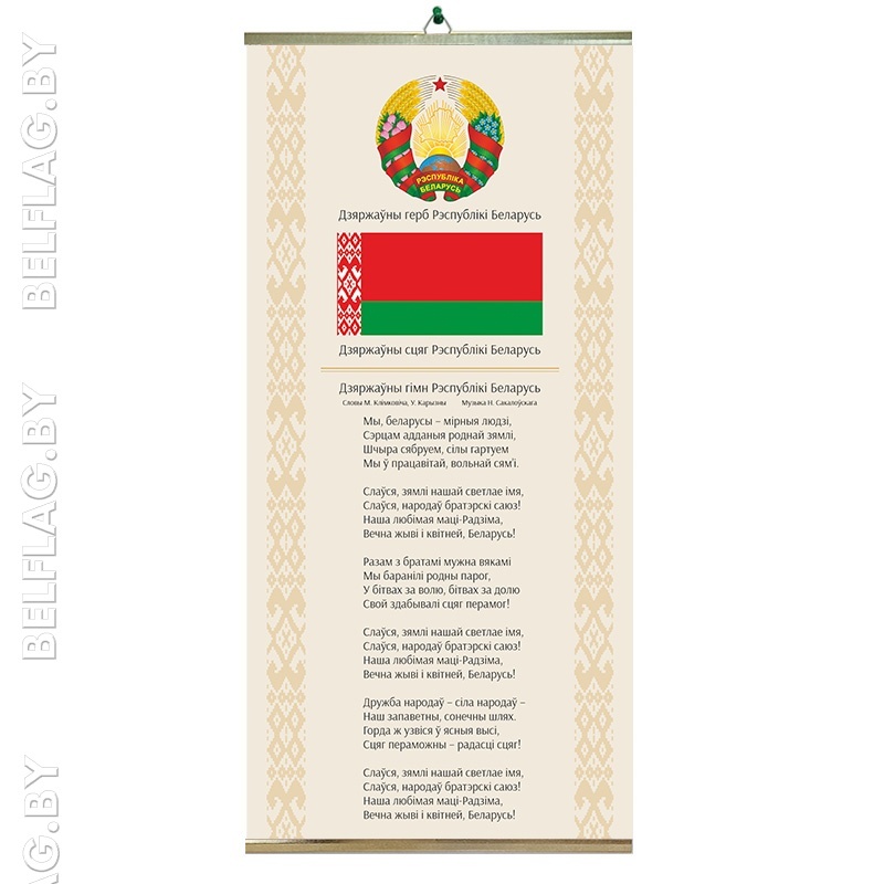 Плакат «Государственные символы РБ: герб, гимн, флаг» 29,7×62 см на бумаге 150 г/м². Оснащён верхней и нижней металлическими планками (ширина 6 мм): сейчас — цвет золото; по заказу возможны белые или серебристые планки. Верхняя планка с держателем для удобного крепления.