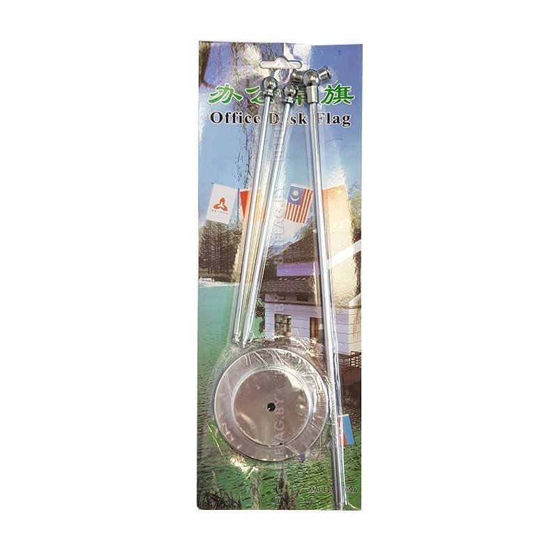 Флагшток выполнен в серебристом цвете, что придает ему стильный и универсальный вид. Основание изготовлено из прочного пластика, диаметром 70 мм и высотой 17 мм, обеспечивающего устойчивость конструкции. Вертикальное металлическое древко длиной 260 мм и диаметром 5 мм гарантирует долговечность, а два баннерных плеча длиной 145 мм и диаметром 3,3 мм позволяют разместить два флага. Навершия выполнены в виде пластиковых шаров диаметром 10 мм, что делает внешний вид флагштока завершенным.
