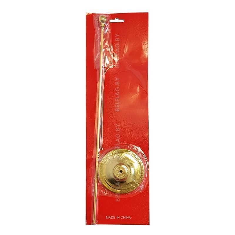 Флагшток изготовлен в благородном золотом цвете, который подчеркивает статус и престиж. Устойчивое основание из пластика диаметром 80 мм и высотой 22 мм обеспечивает надежность конструкции. Металлическое древко длиной 350 мм с диаметром 4,3 мм гарантирует прочность и долговечность. Завершает композицию пластиковое навершие в форме шара диаметром 15 мм, которое придает флагштоку гармоничный внешний вид.