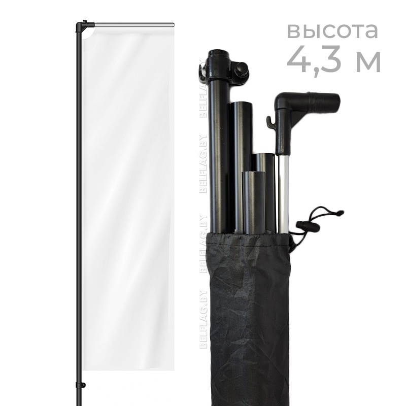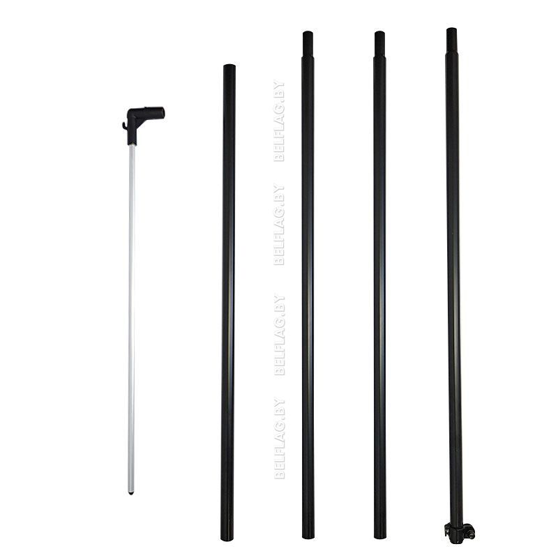 Флагшток состоит из пяти частей (четыре части стойки и перекладина). Толщина стенок стойки 1 мм. Упакован в тканевый чехол черного цвета.