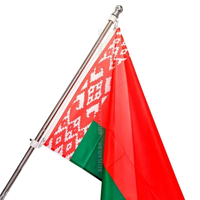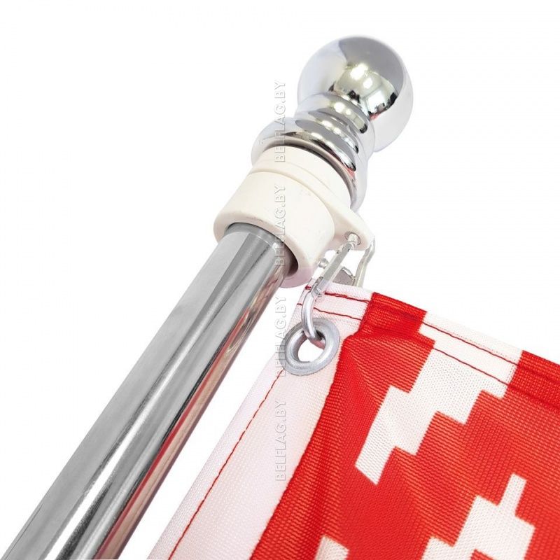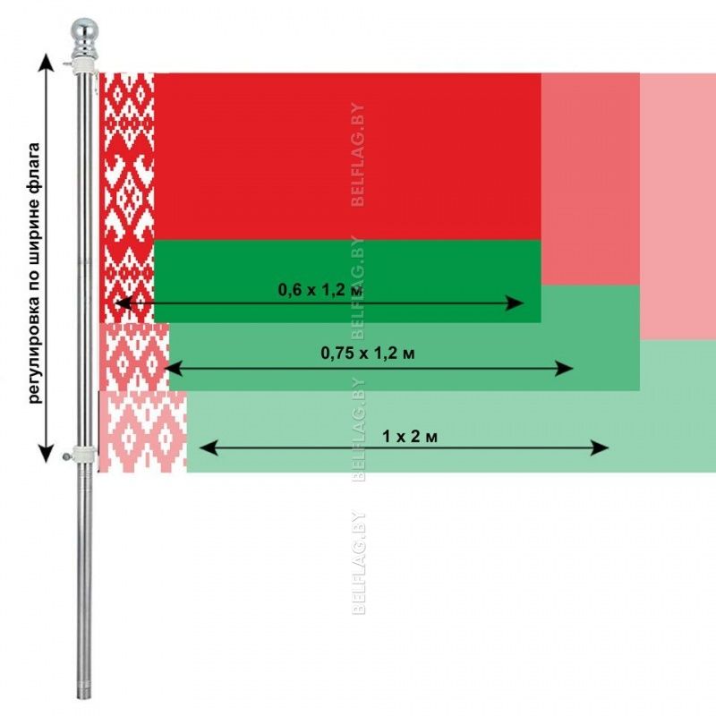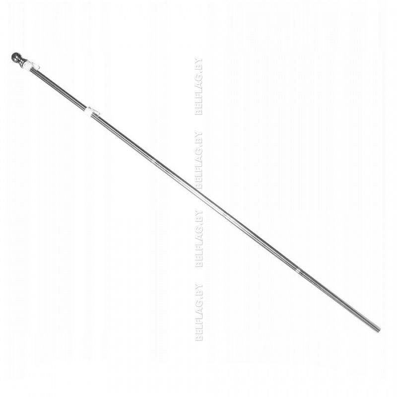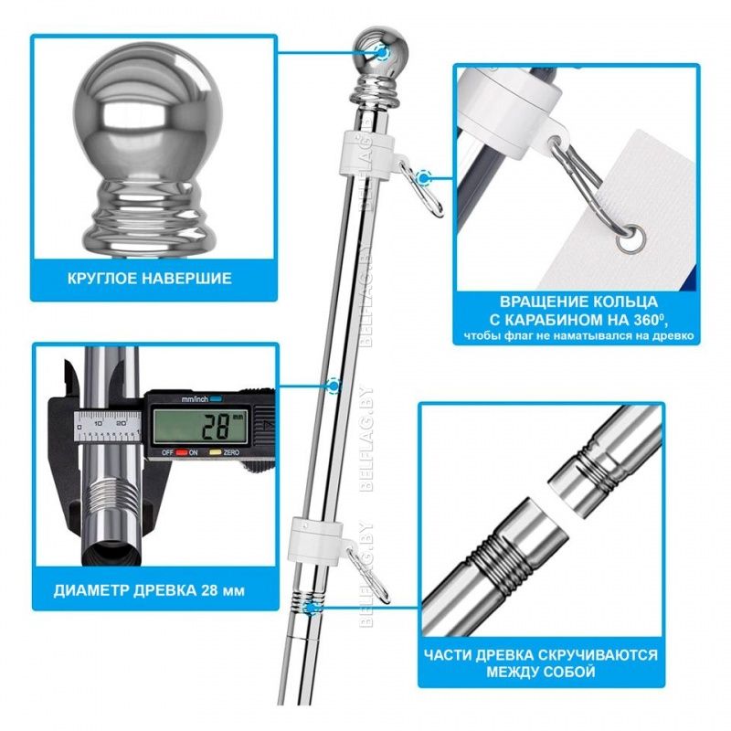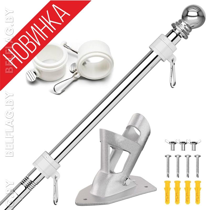 Металлический настенный кронштейн с регулировкой угла наклона древка на 45 и на 90 градусов. Поставляется с металлической мачтой длиной 1,8 м диаметром 28 мм.  Мачта флагштока диаметром 28 мм и состоит из 4-х частей. Можно укоротить длину флагштока можно убрав одну или две части древка. На конце мачты круглое серебристое навершие. На древке имеются подвижные хомуты с фиксаторами и металлическими карабинами. Хомут фиксируется на древке  прижимным винтом в соответствии с шириной флага. Карабины крепятся на свободно вращающихся кольцах, что не позволяет флагу наматываться на древко. Регулировка длины мачты позволяет вывешивать флаги 0,5*1м, 0,6х1,2 м, 0,75х1,5 м и 0,9х1,8 м. На флаг устанавливаются два люверса под карабины.