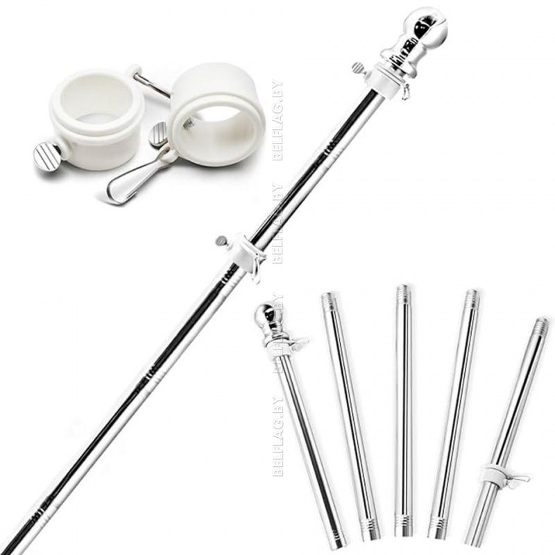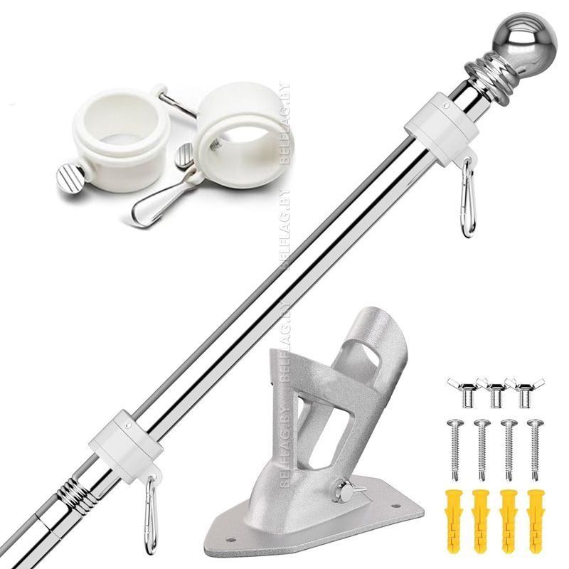 Комплект флагштока из нержавеющей стали, серебристого цвета, длиной 180 см, с двух позиционным литым алюминиевым кронштейном и навершием шар. Древко укомплектовано вращающимися пластиковыми кольцами с карабинами, против скручивания флага. Оптимальный размер флага 60х120 см. Готовое и надежное решение на годы. Цена указана с НДС.