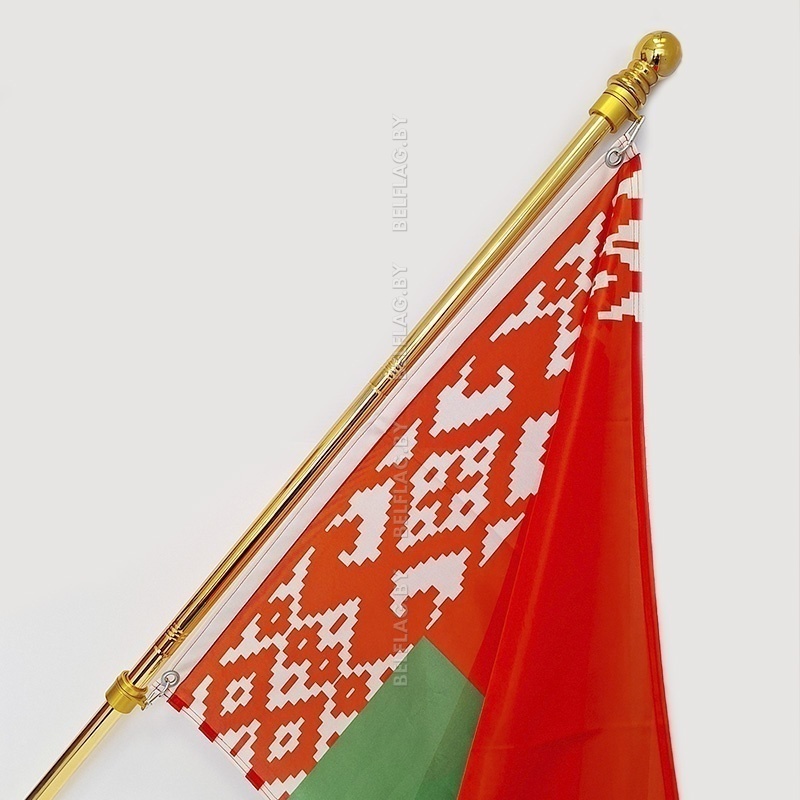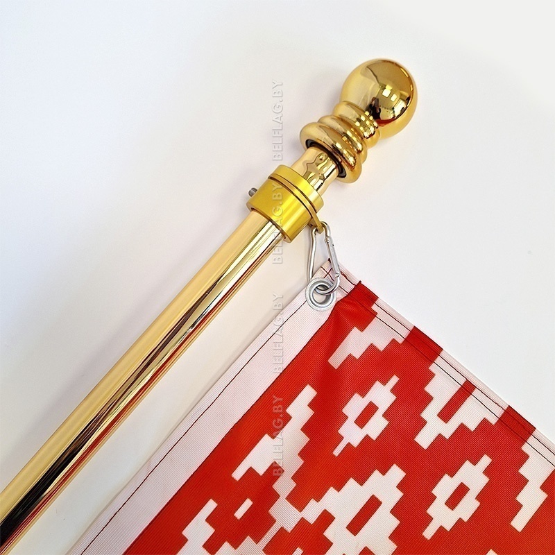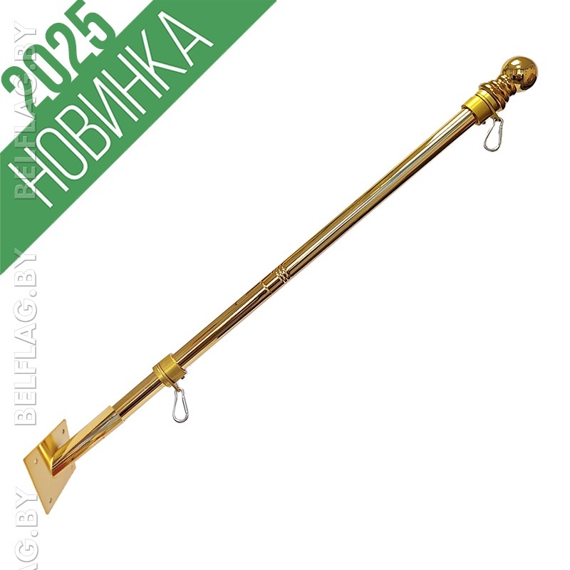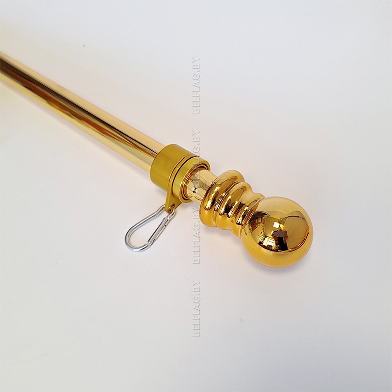 Флагшток выполнен из нержавеющей стали с глянцевым золотым покрытием, что делает его устойчивым к коррозии, механическим повреждениям и осадкам, придавая статусный и торжественный вид. Длина флагштока 180 см, что позволяет экспонировать флаги средних размеров.