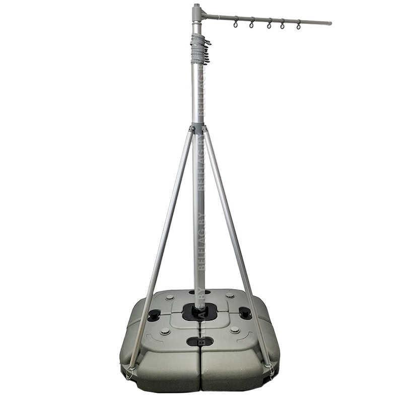 Флагшток телескопический высотой 5 метров с баннерным плечом — это идеальный вариант для временных мероприятий. Древко выполнено из прочного алюминиевого сплава, что делает конструкцию легкой и надежной. Флагшток фиксируется на устойчивом пластиковом основании, которое заполняется водой, ориентировочный объем 100 л, для повышения стабильности всей конструкции.