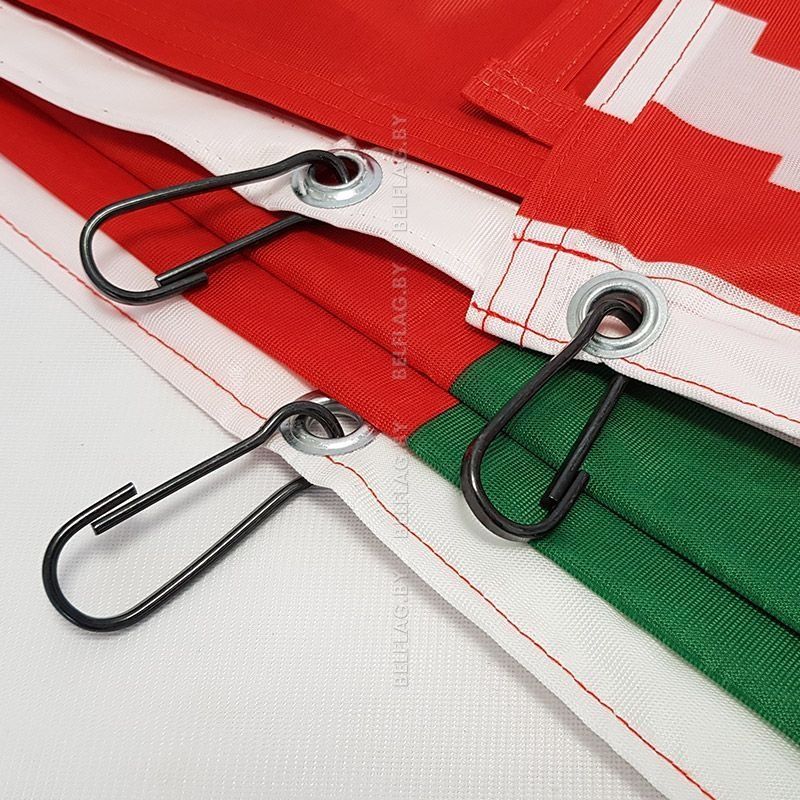 Металлические карабины вставляются в люверсы, которые пробивают в усиленной корсажной лентой части флага. Количество карабинов и расстояние между ними индивидуально.