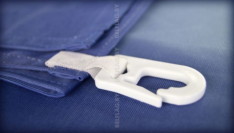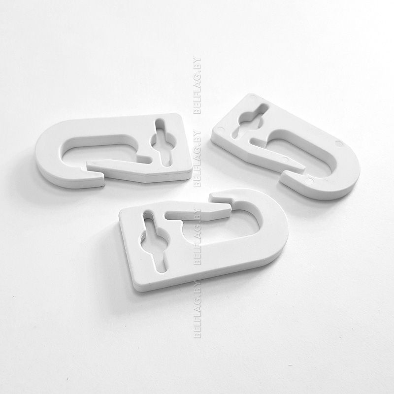 Пластиковый карабин предназначен для пришивания к флагу с помощью петель. С помощью карабина флаг крепится к тросу подъёмного механизма, кольцам, утяжелителю.