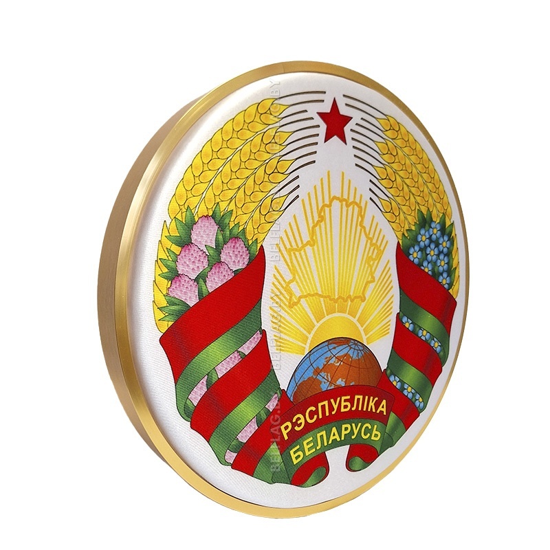 Герб Республики Беларусь, объемный на атласе, в золотой раме — это стильное и торжественное решение для оформления государственных учреждений, офисов или учебных заведений. Герб диаметром 40 см выполнен на высококачественном атласе, размещен на поролоновой подушке для объема и закреплен на подложке из ДВП. Золотая алюминиевая рама добавляет изделию элегантность и завершенность. Доступны варианты диаметром 30 см и 50 см. Цена указана с НДС.