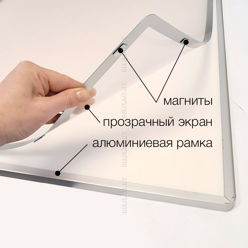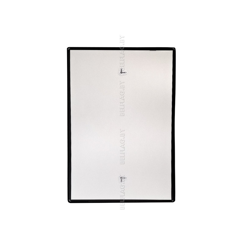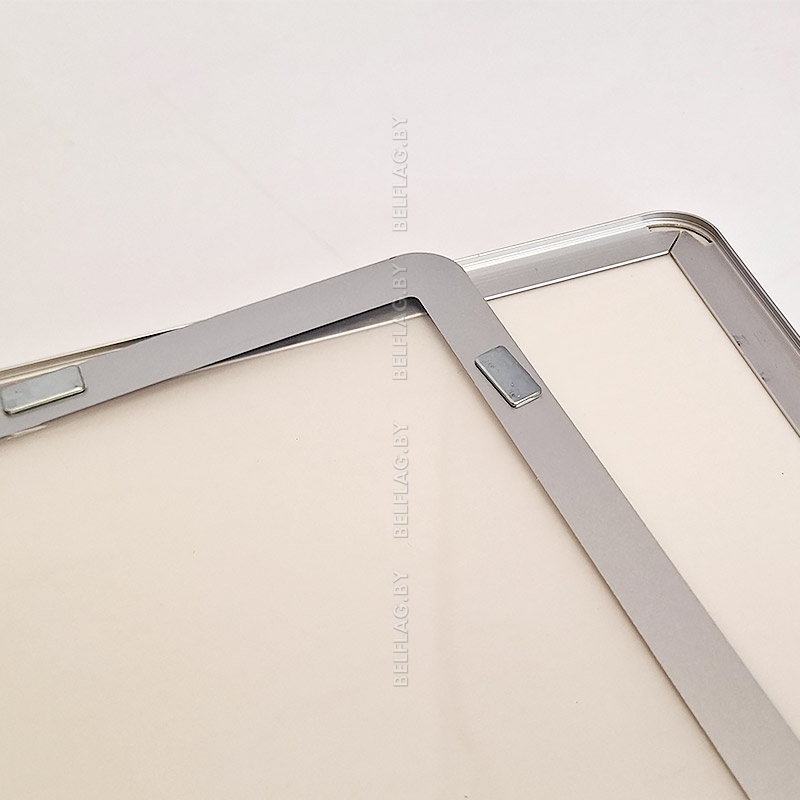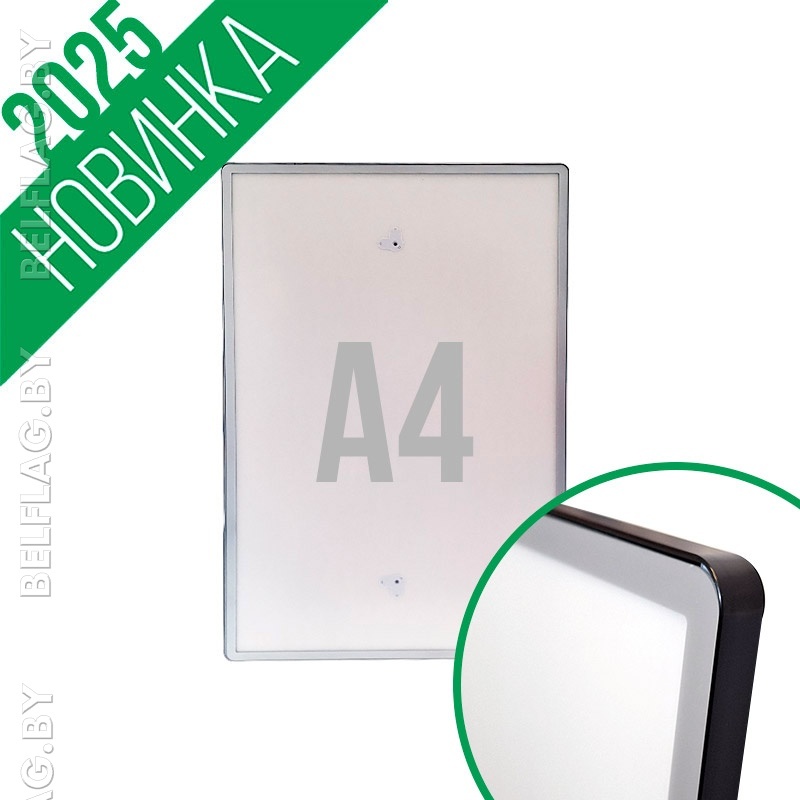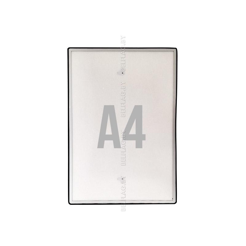 Алюминиевая рамка формата A4 со скруглёнными углами в чёрном цвете и прозрачным пластиковым экраном с серо-серебристой рамкой на магнитах. Толщина 14 мм. Новинка на рынке Республики Беларусь.