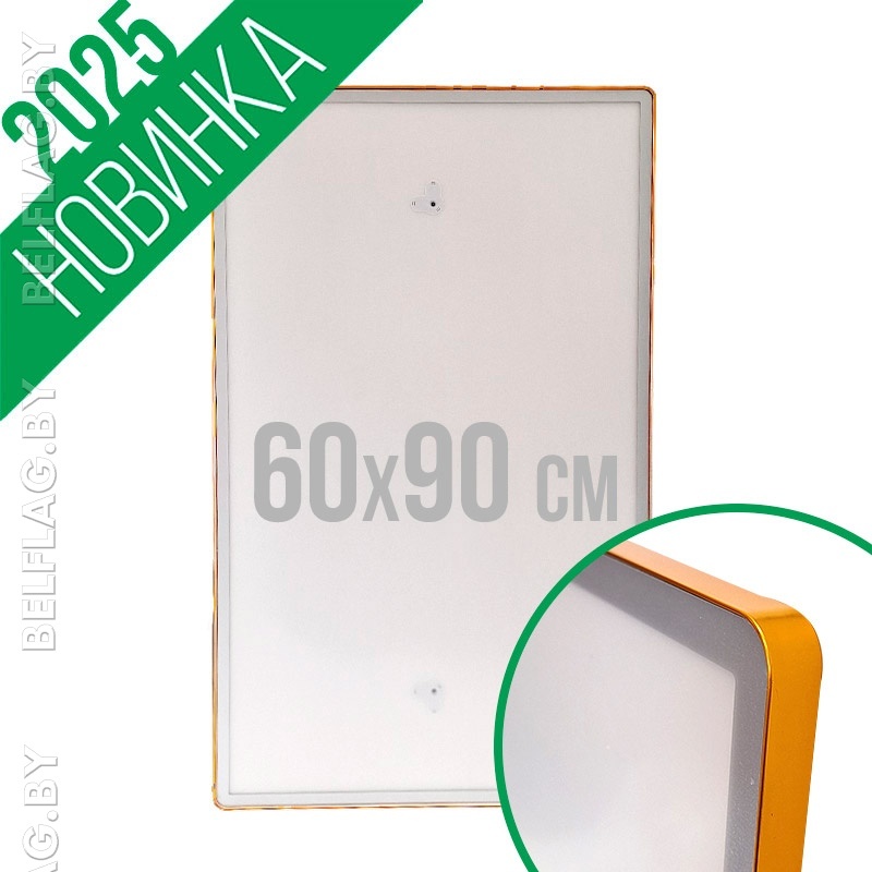 Рамка алюминиевая с прозрачным пластиковым экраном на магнитах, размер 60×90 см, цвет золото/серебро — новинка на рынке РБ. Современный премиальный дизайн: золотой алюминиевый корпус и прозрачный магнитный экран с рамкой в серо‑серебристом цвете. Идеальна для постеров, афиш, меню и рекламных материалов.