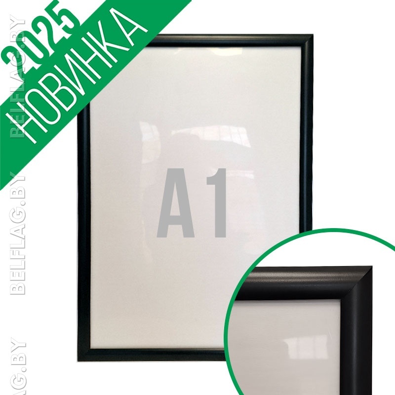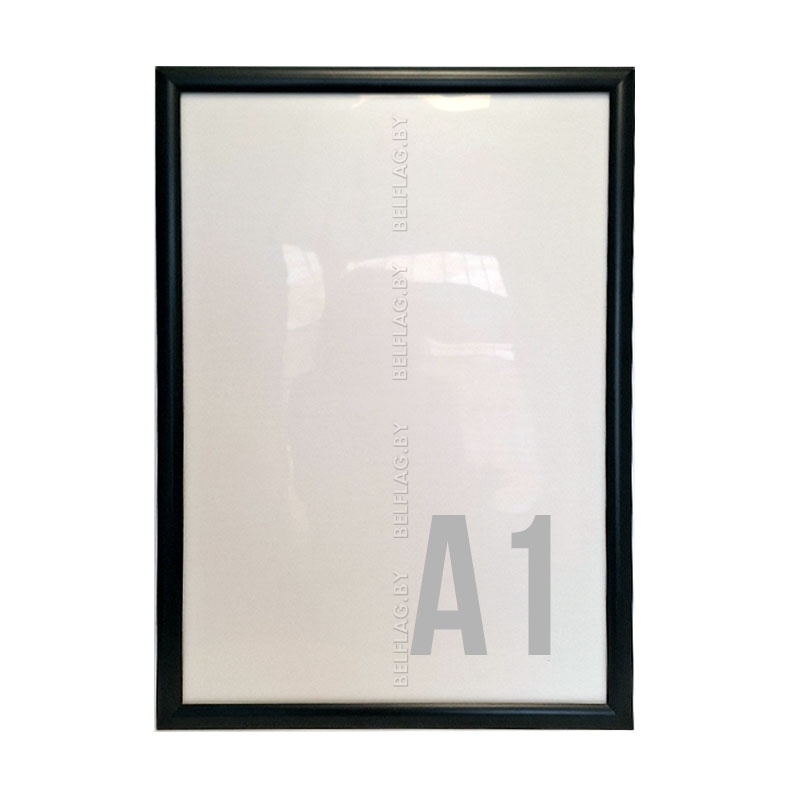 Алюминиевая рамка формата A1 в чёрном цвете с защёлкивающимся профилем 25 мм. Настенное крепление, защитная панель ПВХ, крепёж и услуги печати постеров под заказ.