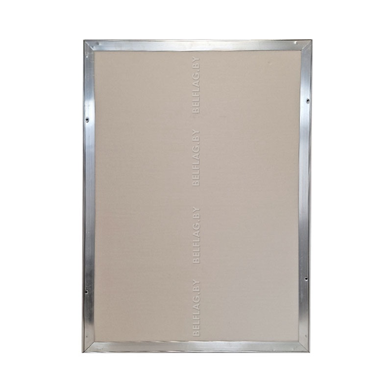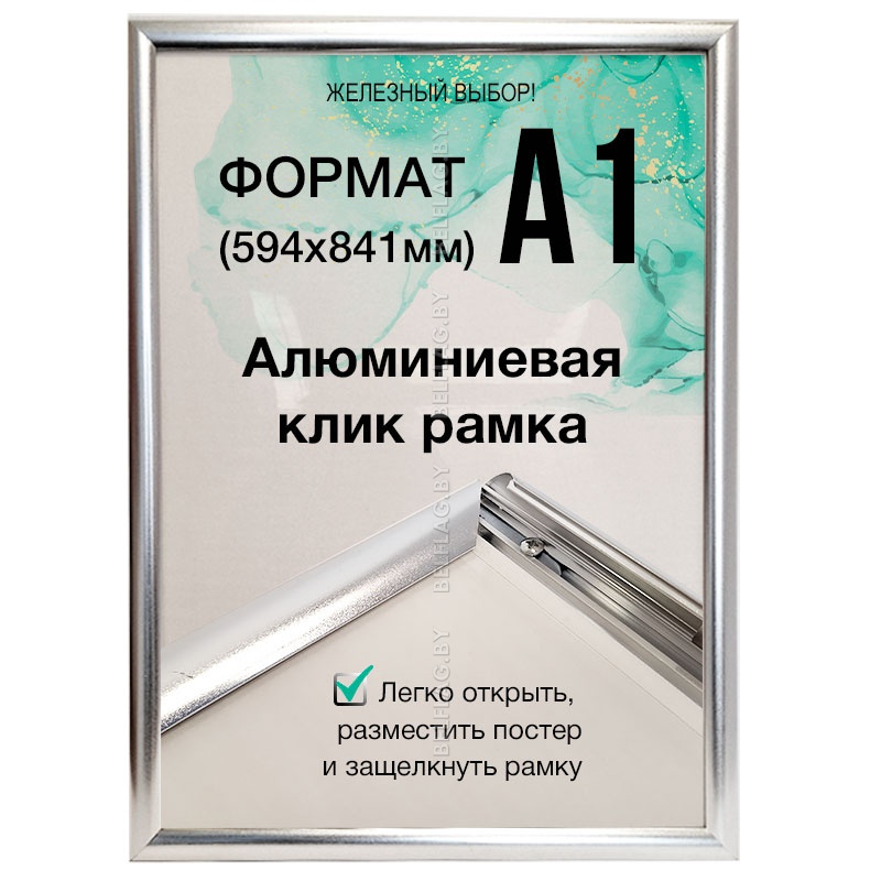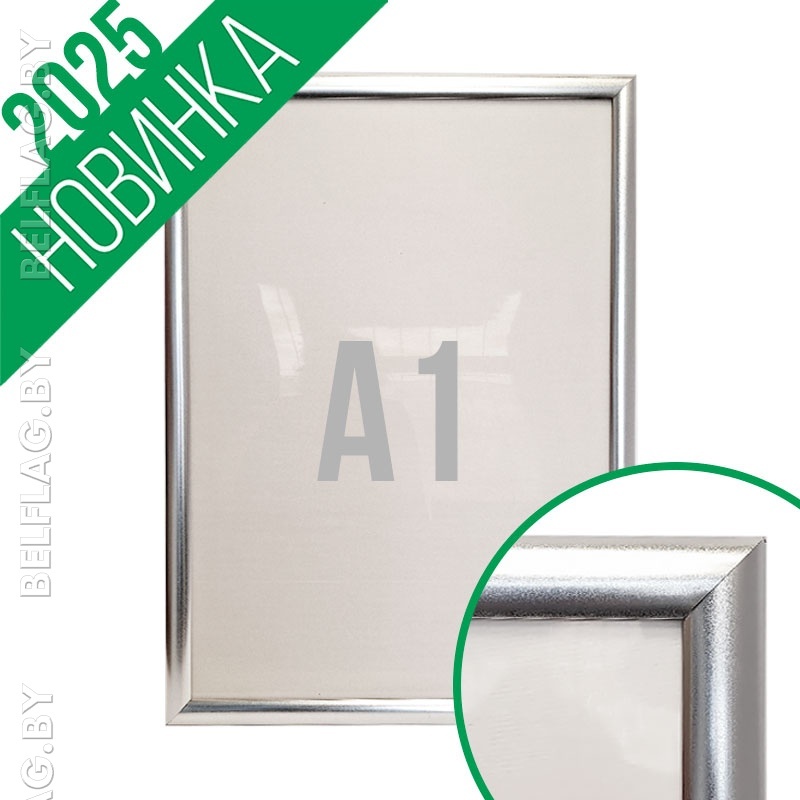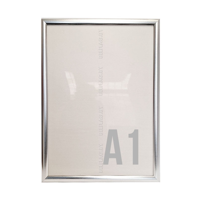 Алюминиевая рамка формата A1 в серебристом цвете с защёлкивающимся профилем 25 мм. Настенное крепление, защитная панель ПВХ, крепёж и услуги печати постеров под заказ.