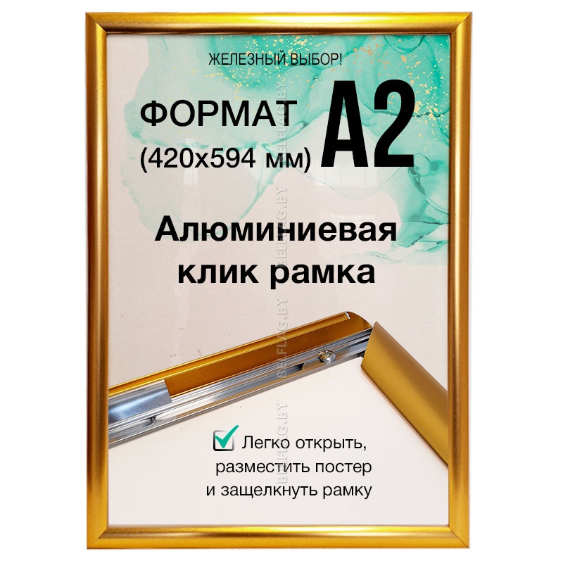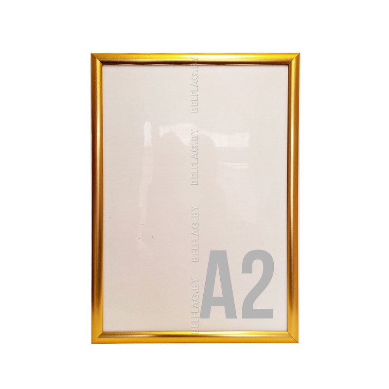 Алюминиевая рамка формата A2 в золотом цвете с защёлкивающимся профилем 25 мм. Настенное крепление, защитная панель ПВХ, крепёж и услуги печати постеров под заказ.