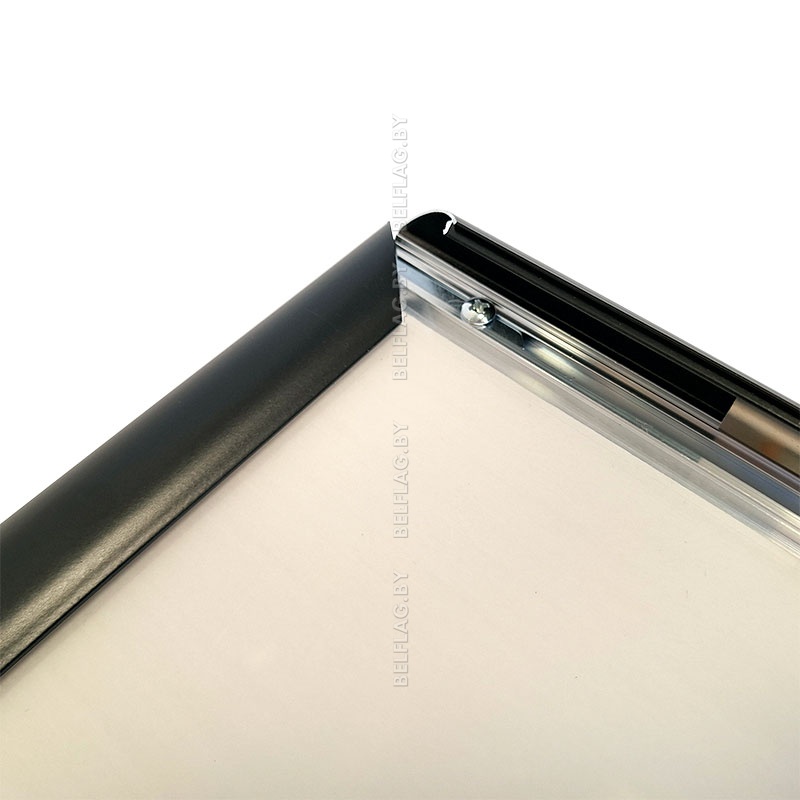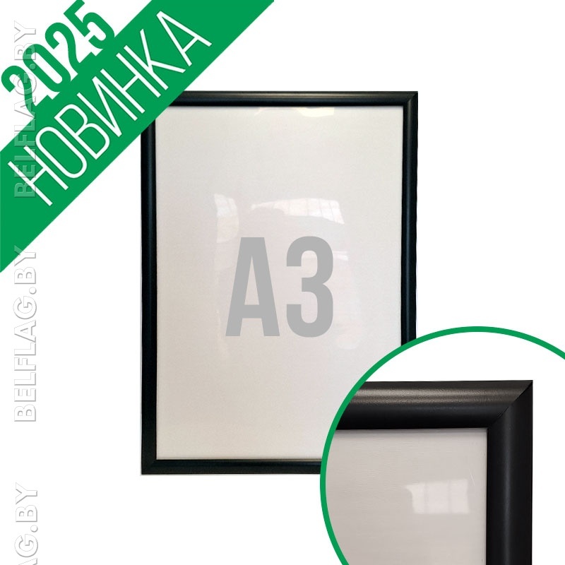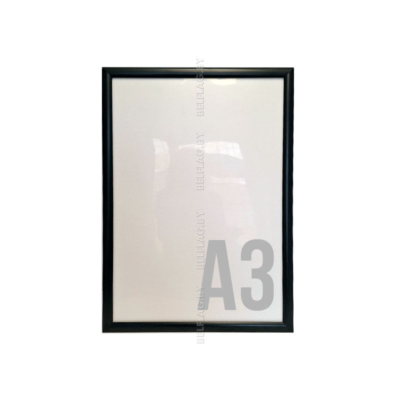 Алюминиевая рамка формата A3 в чёрном цвете с защёлкивающимся профилем 25 мм. Настенное крепление, защитная панель ПВХ, крепёж и услуги печати изображений под заказ.
