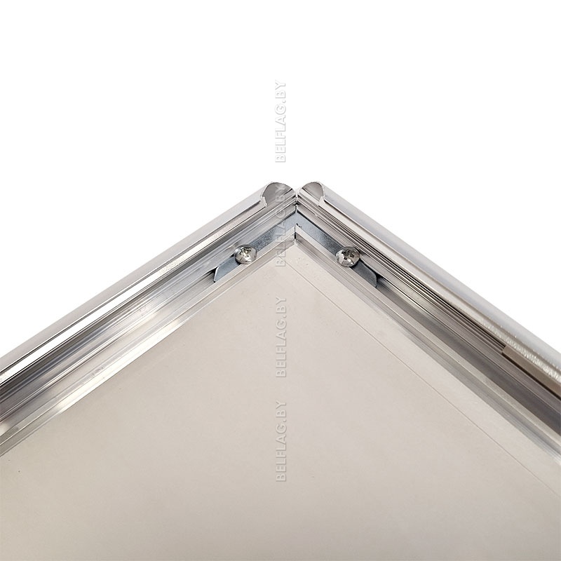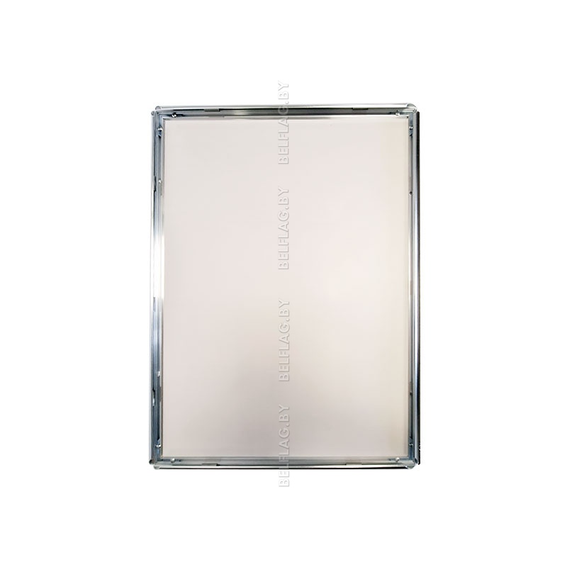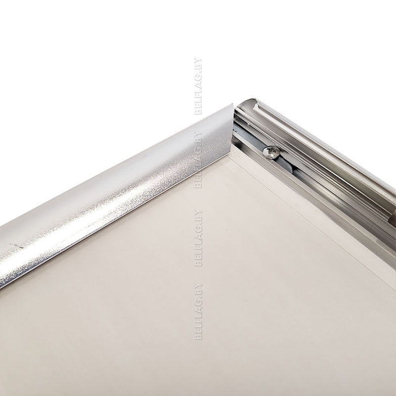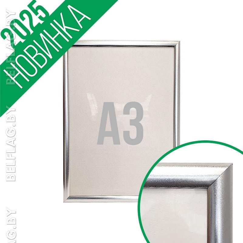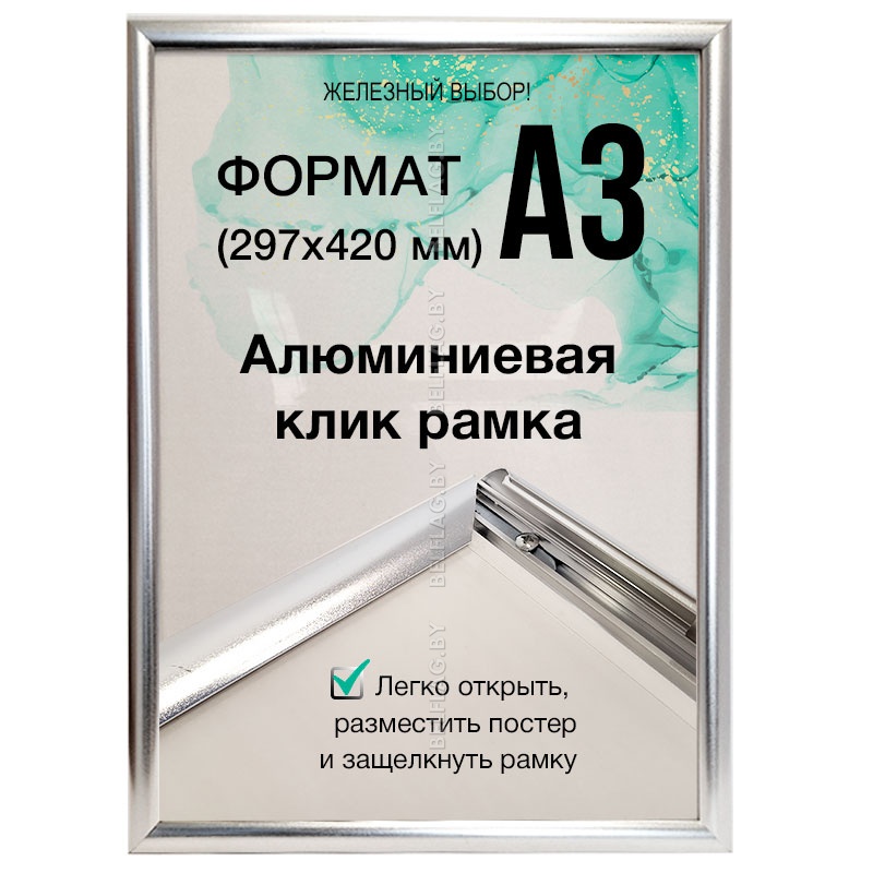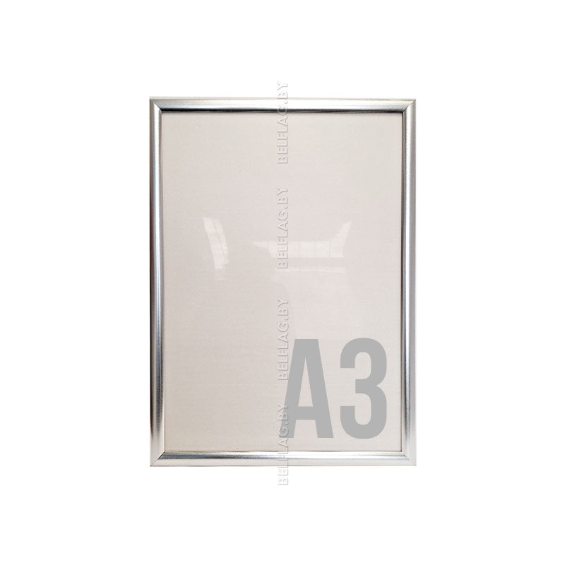 Алюминиевая рамка формата A3 в серебристом цвете с защёлкивающимся профилем 25 мм. Настенное крепление, защитная панель ПВХ, крепёж и услуги печати изображений под заказ.